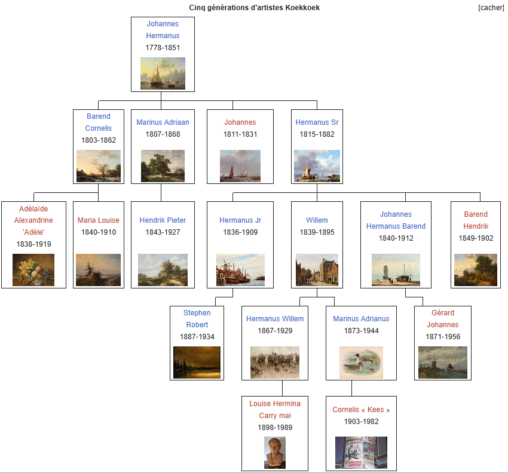 Image mise en avant : La famille Koekkoek (4 générations). La famille Koekkoek La famille Koekkoek est une famille néerlandaise qui a donné naissance à de nombreux peintres, principalement au XIXe siècle. Avec un total de dix-huit peintres répartis sur cinq générations portant ce nom, la famille Koekkoek est considérée comme l’une des plus importantes familles de peintres au … Lire la suite de La famille Koekkoek