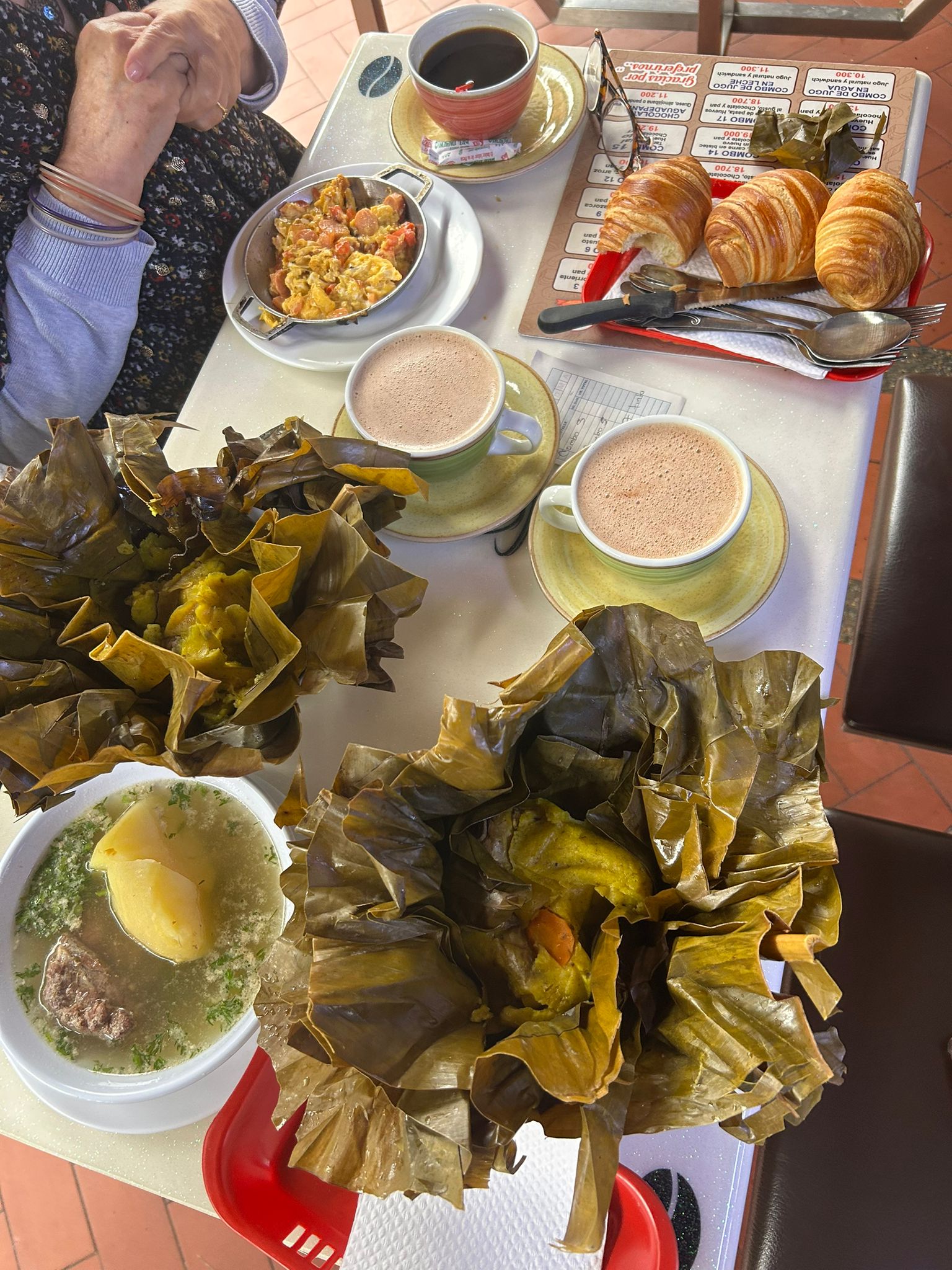 Thomas: Une idée d un petit dej colombien. Le truc vert : talmal = riz viande cuit dans feuilles de bananier : c est bon
