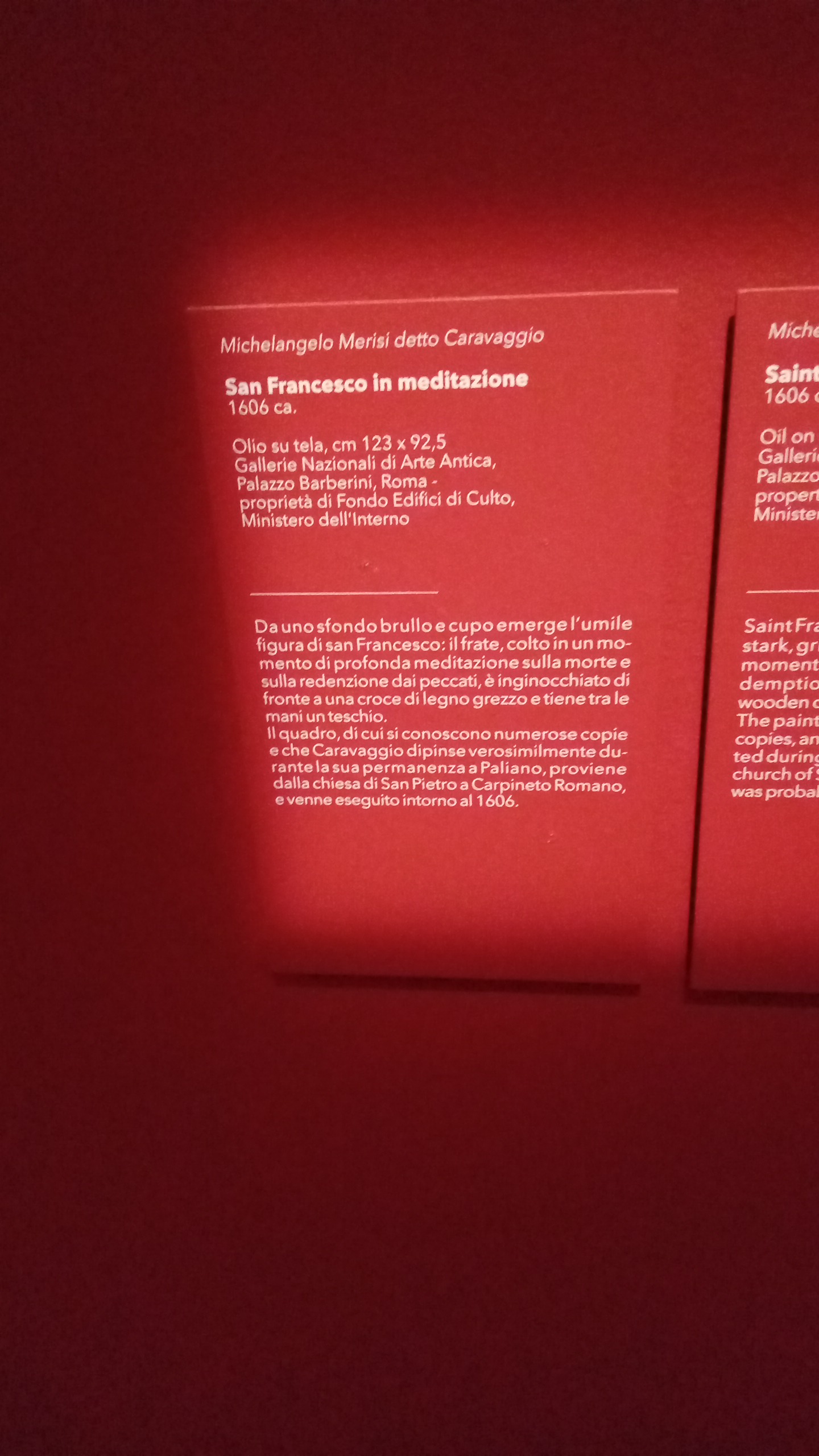 Ce tableau est retrouvé par la chercheuse Maria Vittoria Brugnoli en 1968 dans l’église San Pietro de Carpineto Romano dans le Latium, avant de rentrer dans les collections nationales de l’Italie[1]. Une copie remarquablement similaire se trouve également dans l’église Santa Maria della Concezione dei Cappuccini de Rome[1] : jusqu’à la redécouverte du tableau de Carpineto, c’est le tableau de Rome qui était considéré comme l’original[2].