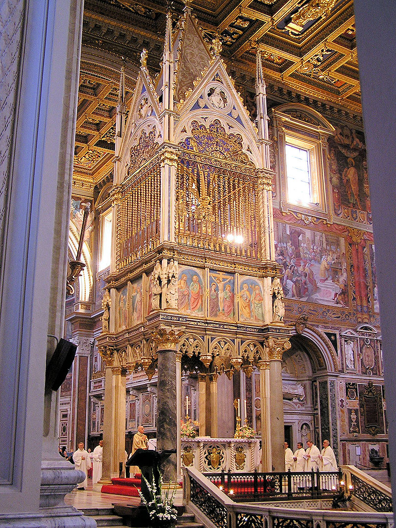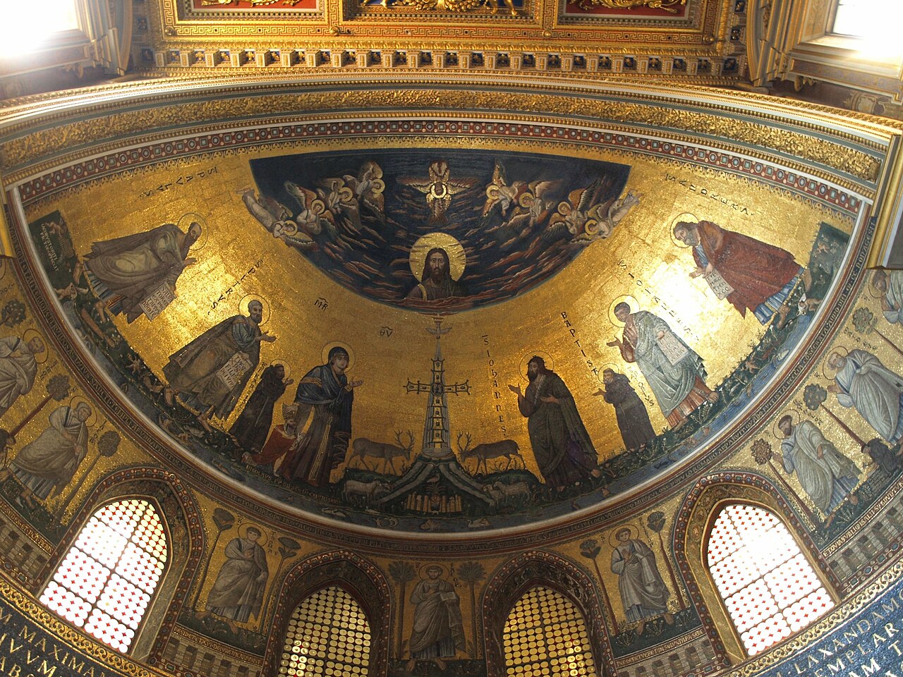 Mosaïques de l’abside. La mosaïque centrale avait été réalisée par Jacopo Torriti et Jacopo da Camerino, qui y avaient inclus une image plus ancienne du Sauveur. L’actuelle n’est qu’une refonte réalisée par les mosaïstes de Léon XIII, qui n’ont réutilisé que les carreaux de mosaïque dorés du fond.