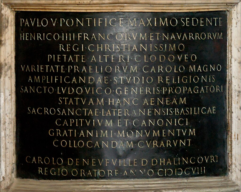 Inscription sur la base de la statue d’Henri IV sous le portique du transept droit, mentionnant l’attribution du titre de chanoine d’honneur aux rois de France.
