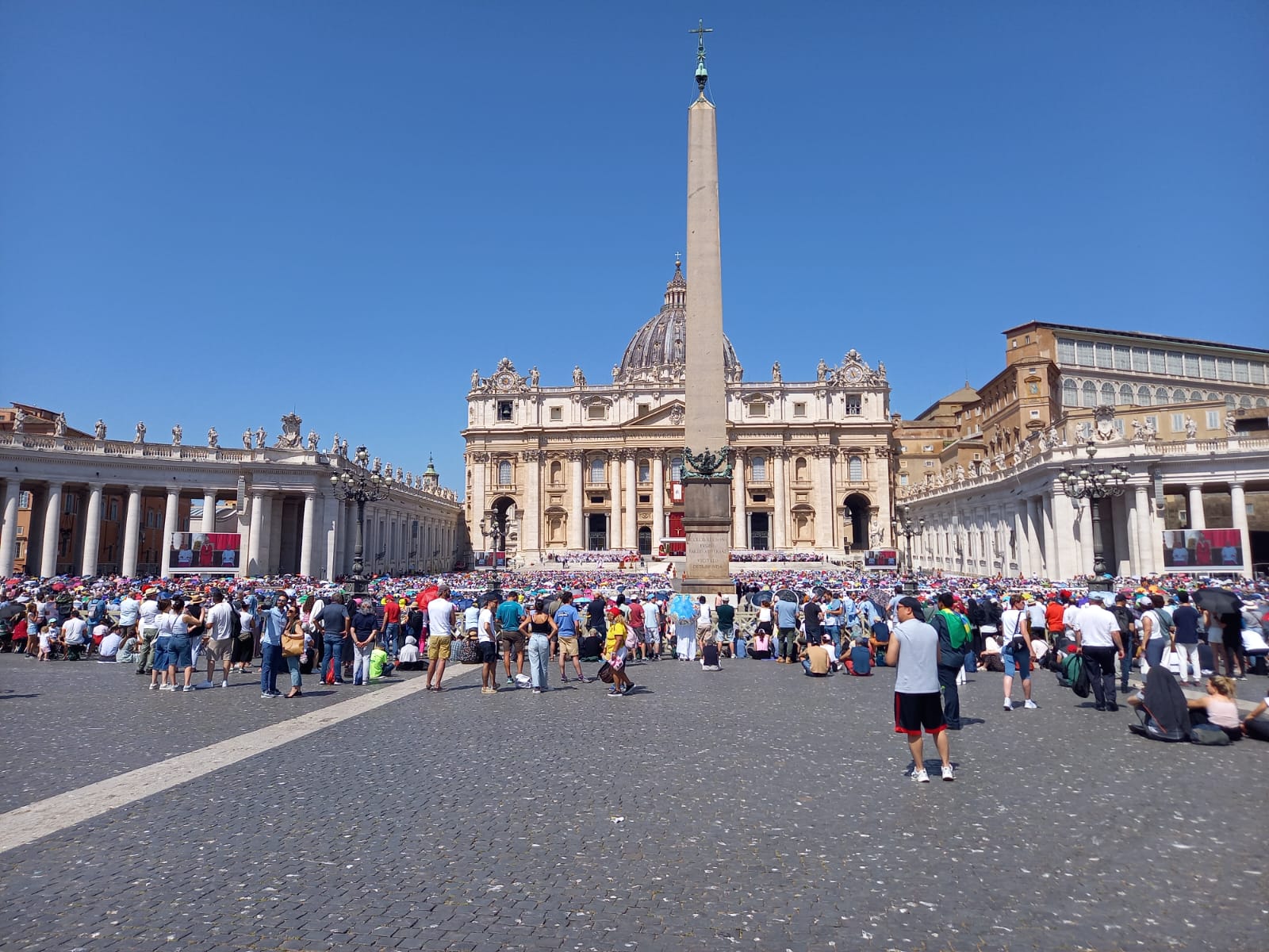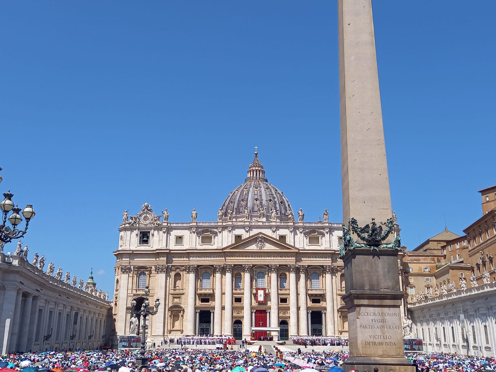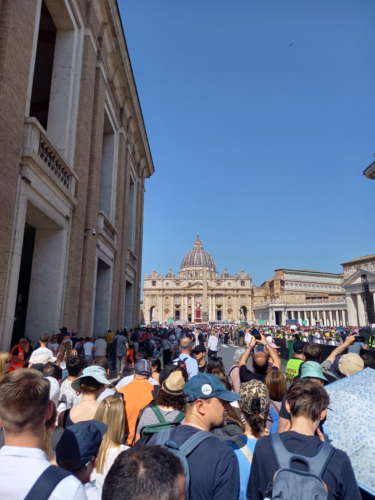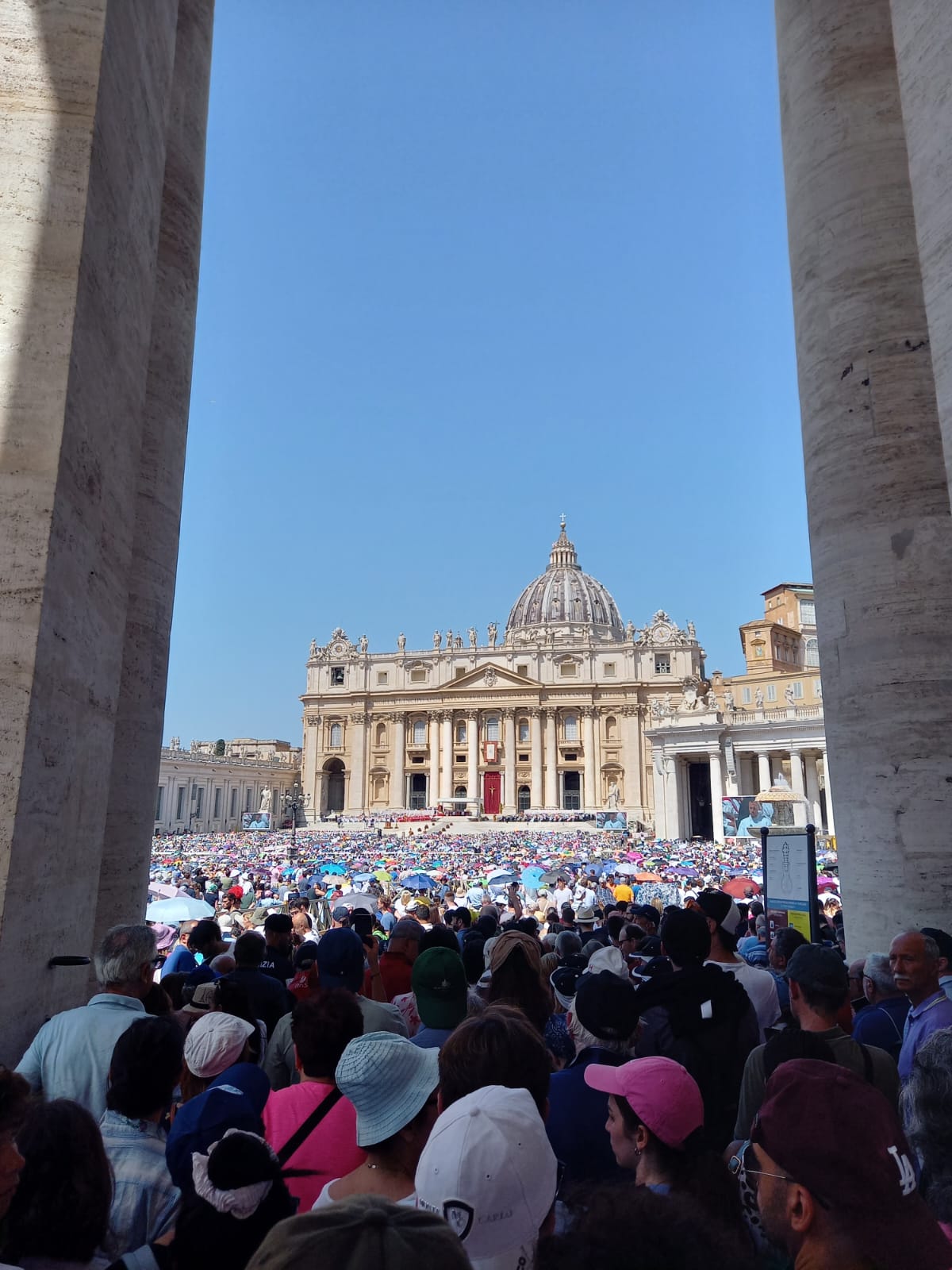 Bien évidemment visiter Rome c’est voir Saint Pierre. Nous avions pas conscience que c’était Pentecôte et qu’elle ne fut notre surprise quand nous avons vu une place bondée, archi bondée et au milieu de cette foule en fièvre la Papa Mobile et notre nouveau Pape tout de blanc vêtu !