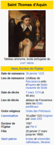 Thomas d’Aquin, né en 1225 ou 1226 au château de Roccasecca près d’Aquino, dans la partie péninsulaire du royaume de Sicile (Latium), et mort le  à l’abbaye de Fossanova près de Priverno dans les États pontificaux (dans le Latium également), est un religieux italien de l’ordre dominicain, célèbre pour son œuvre théologique et philosophique.